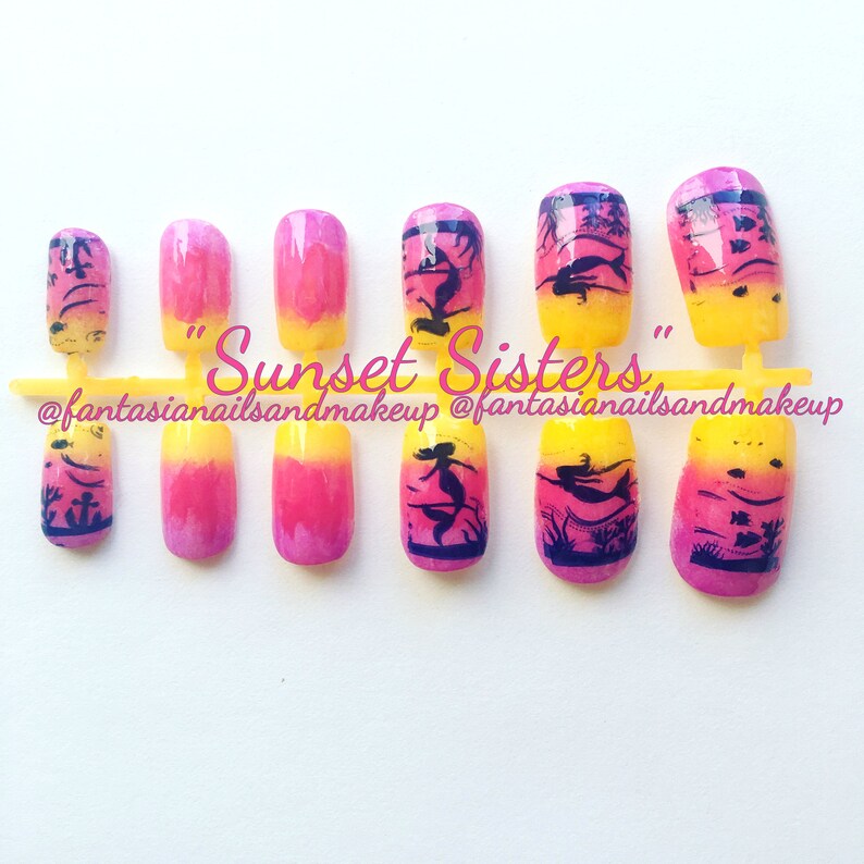 Pink Ombre Mermaid Nails Orange Purple Nails Press On Nails Glue On Nails Fake Nail Set False Nails Faux Nails Square Acrylic Nails